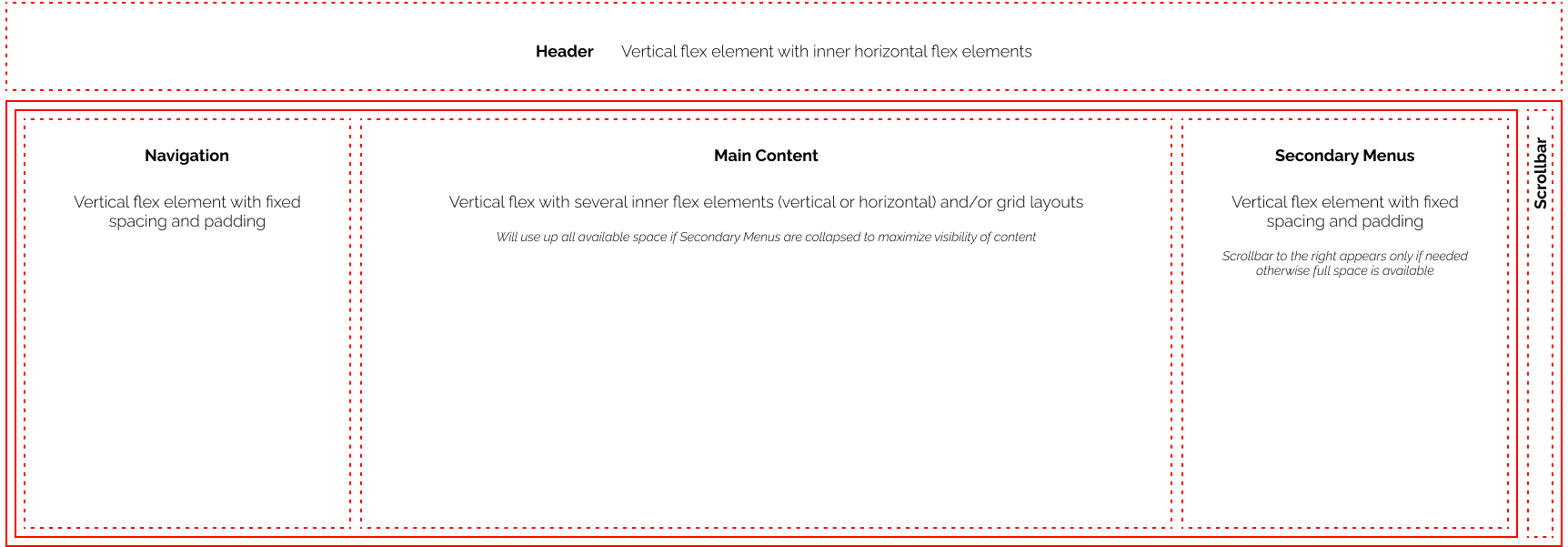 Below is a wireframe of the new layout in order to isolate all the different sections and ensure they don't interfere with each other. The header is now a separate element that has no scrollable overflow and is fixed in position